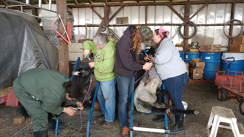 (Bottom, l-r - A very nekkid Garnet; the crew from WSU does hoof trimming, deworming, and vaccinating; nekked sheep being loaded back into the horse trailer.)