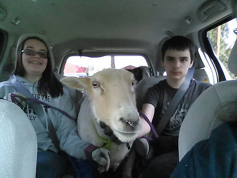 See that look on my son's face? That's the look of a tired boy, straining to hold back a 180-pound sheep from making his way to the driver's seat of the Sienna. While Mom takes pictures. Elise was a bit more cheerful about it - or else she just puts on a brave face while hilarity ensues!