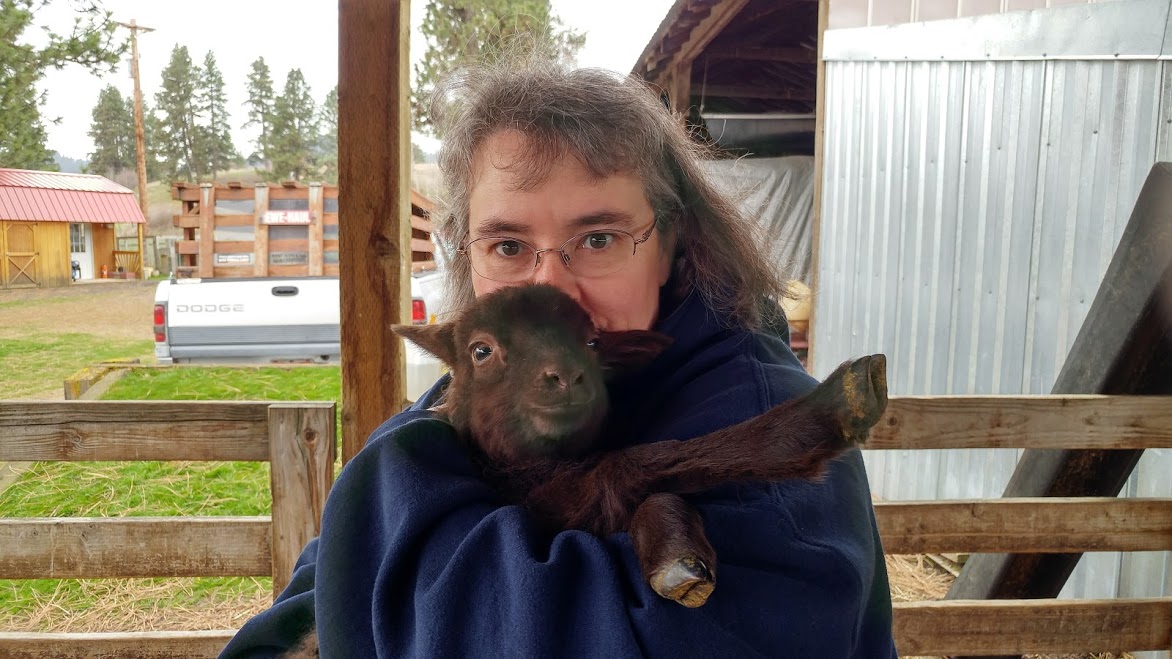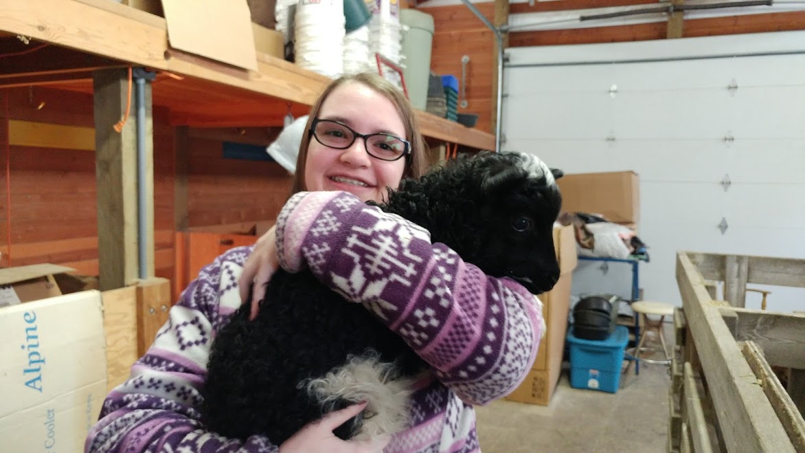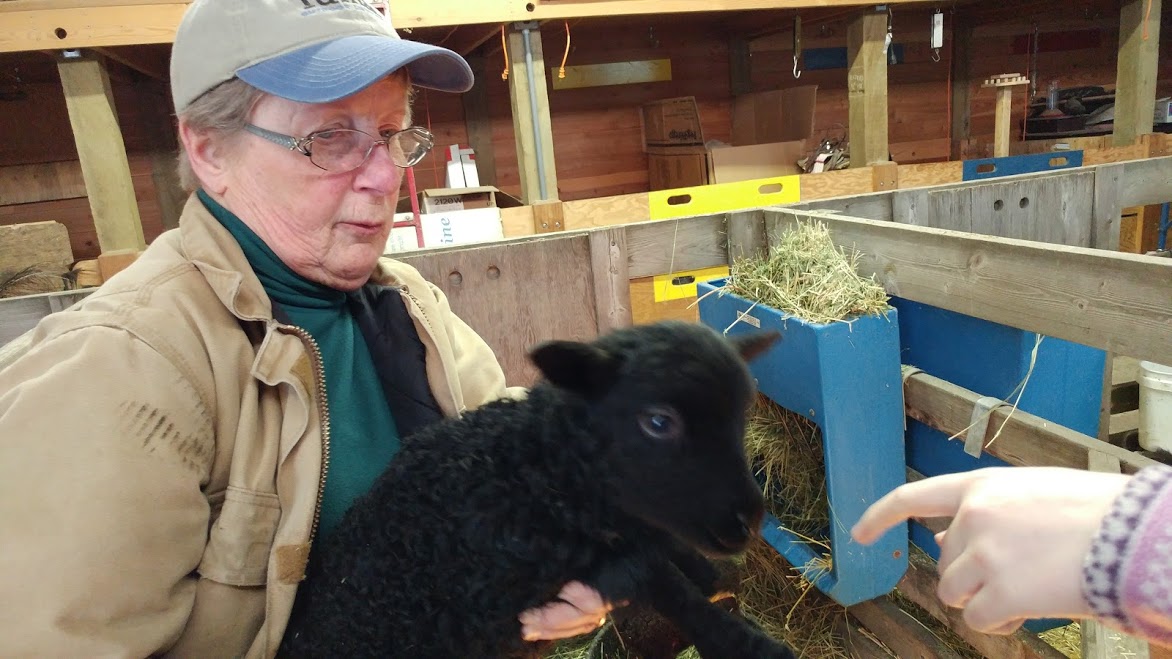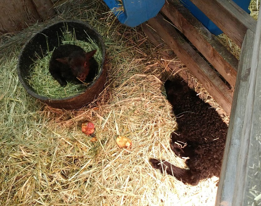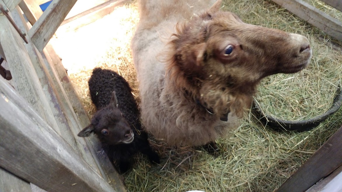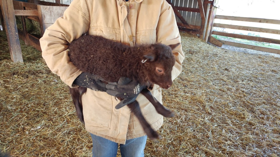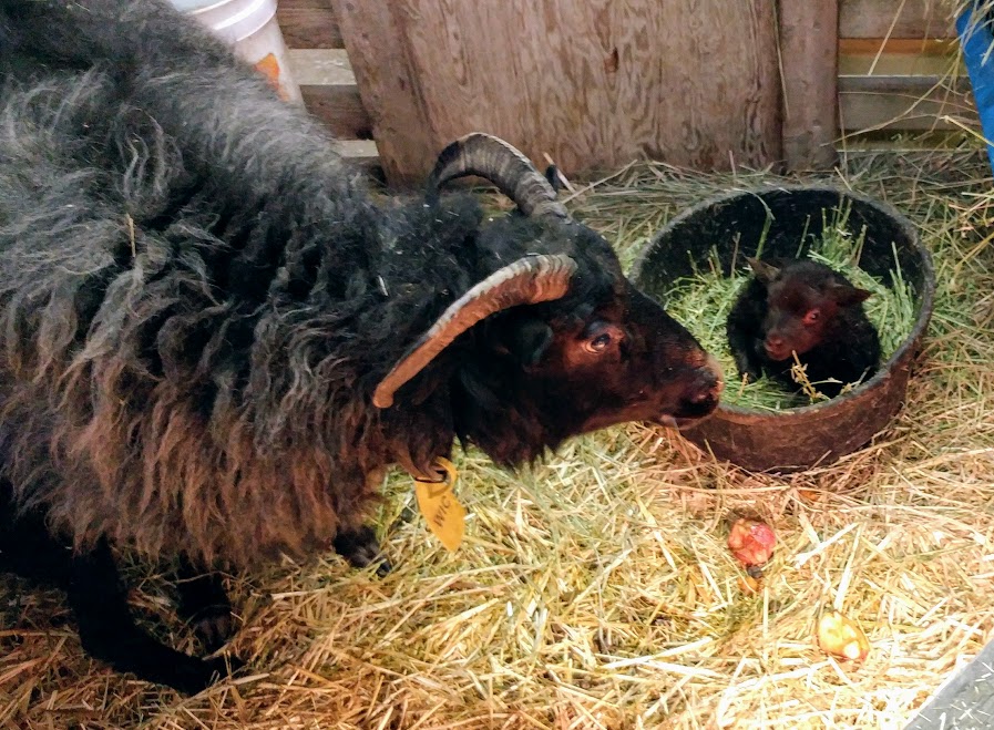Again, I promise there were three! WIC gave birth to a tiny little ram (the brown one in his mama's grain pan), as well as another ram and a ewe, both gorgeous black! Lee said that the little brown boy would probably make a good wethered fiber pet - he was just so small, she didn't think he would make a good ram for breeding. Well, you know me...I hear the words "wether" and "fiber," and see this tiny little boy curled up in a pan...I kind of fell in love. A lot. And his sister? Look at this face!!!