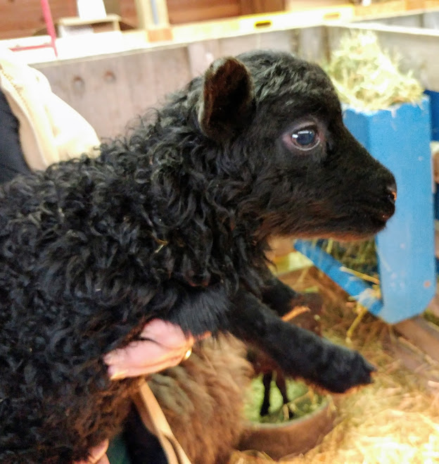 So over the next few weeks we kept visiting to see how things were going...by this point I had named them (Radagast the Brown and Rosie Cotton)...and yes, Lee had said I could buy them! Not having either brown or black fiber in my flock, I was pretty anxious to be able to add that into the mix - and both of these lambs will likely remain those colors. When a lamb is born with a dark coloring like that, you can oftentimes tell if they will remain that color simply by looking at their lips! If they have "sugar lips" - if their lips are a lighter color, sprinkled with gray or white - their fleece will lighten up over time. You can see that in Prima Donna's little ram lamb: