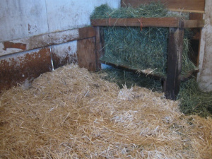 As far as the straw, yes - I can and did put down clean, dry straw for them. He wondered, though, about removing the old straw first. The reason I don't do that - and the reason people don't clean out their barns in the winter time - is that the excrement and urine, underneath those layers of clean straw, actually helps to keep them warm, much like a compost pile is warm inside. Sounds gross, but they burrow down and make little hollows to sleep in, and I don't want to remove any of that organic heating material if it helps! So today, they got a new bale of fresh barley straw: