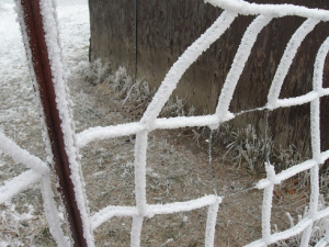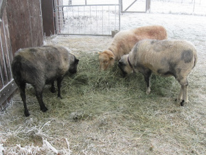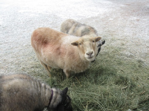 First of all, we can't warm up the barn. I've heard so many horror stories about barn fires because of well-meaning shepherds trying to keep their flocks warm in the winter time. And in their wee barn, one spark and it would be all over. So David has patched as many holes as he can that were letting in wind, and at night, we close the sliding door that allows us to put hay into their feeders from the hay storage portion of the barn. As long as the doors are shut, it's not warm, but it's not unbearable for them.