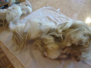 His tog is SO LONG, and his þel is different than Panda Bear's - this was especially interesting to discover because I assumed that, because they are twins, their fleece would be alike - nope! Mikey's þel has much more crimp to it, and has more of the Columbia/Rambouillet feel to it than Panda Bear's. Of course, this shouldn't be surprising because he looks different than she does - I just didn't know it would extend to differences in their fleece!