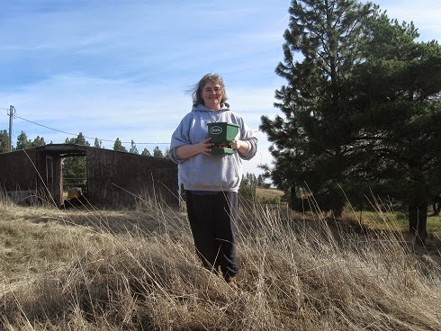 Today (2/12/15), I realized that our weird spring weather is going to make frost seeding a bit difficult - I checked the weather forecast and discovered it's not even supposed to get to freezing at night for the rest of the month. Sigh...I suppose I might luck out and get one really cold night, but as it's looking a bit doubtful, I figured I'd best get those clover seeds out in the pasture now before it gets any warmer (it ended up being 60 here today...ACK...what happened to winter?!?). So my Dear Daughter and I went outside with my trusty new handseeder and clover seeds:
