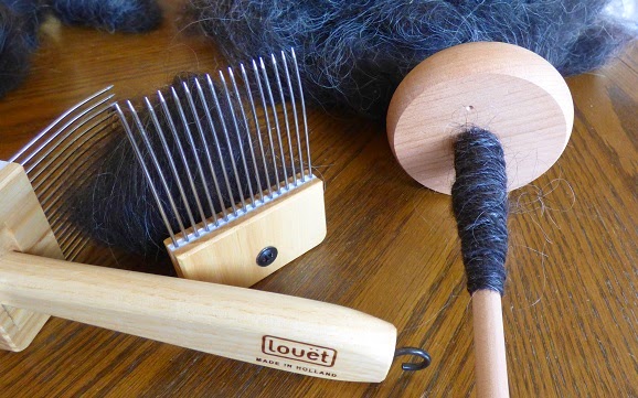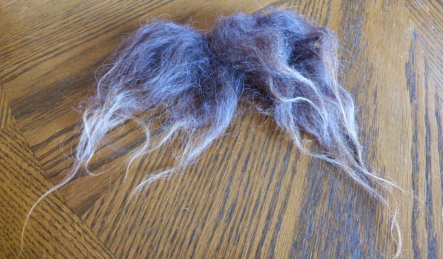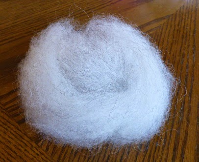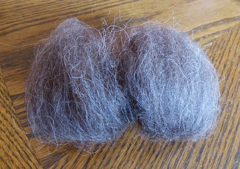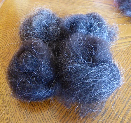So now, in order to comb or card, I was supposed to either do hand-picking or run the fleece through a picker, which is a tool that helps to open up the fleece, allowing leftover dirt and VM to fall out, and to make combing easier. Well, I don't own a picker, so I just played with it for a bit, then started combing it, and ended up with these little nests of combed fiber: