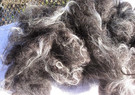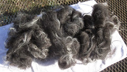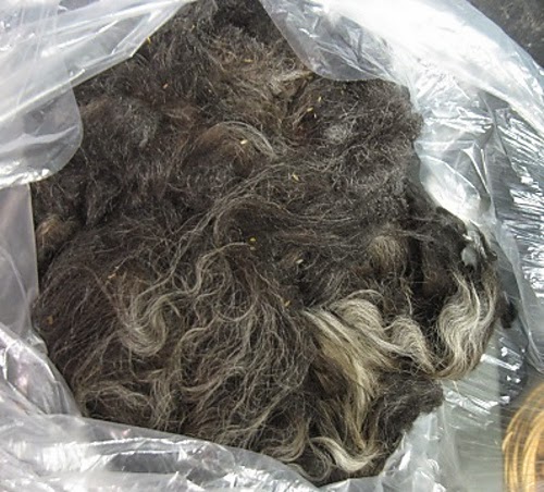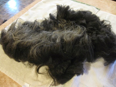 You can see a lot of VM - seeds, grasses, etc., and this isn't even looking deep inside the fleece - there is a lot more in there! But check out the beautiful colors - the thel (undercoat) in the grays and blacks, and the tog (outer, longer locks) in white and gray - yes, I am quite enamored of Icelandic fleece!