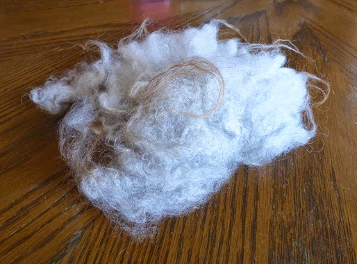 After gently squeezing the soap out of the thicker sections of the fleece, I let it sit for about another 30 minutes. I then lifted it out of the water, gently squeezed as much water out of it as I could, and wrapped it up in clean towels - and continued to gently squeeze the excess water from the fleece. I set up my drying rack in our spare bedroom (where our kitties aren't allowed!), and hung the locks and pieces of fleece out to dry! By the next day, I had some beautiful, clean fluff: