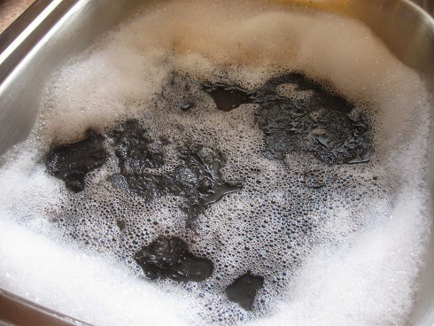 Then I filled up my kitchen sink with scalding hot water and Dawn dish soap, and set the fleece on top of the suds - I hardly had to push it into the water because once the fleece starts soaking up the water, it sinks pretty rapidly. I made sure it all got covered in water, then let it soak for about 30 minutes. I didn't want to wait so long that the water cooled off and the lanolin re-congealed back onto the fleece.
